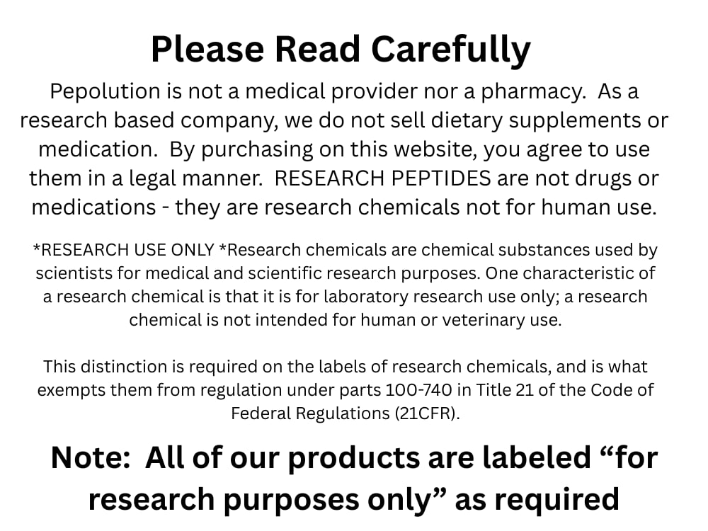 Pepolution does not provide information relating to the use of research chemicals These products are exclusively for research and development purposes only and by purchasing you are agreeing to that. Our products are not dietary supplements or medications. It is your responsibility to use them in a legal manner. All research chemicals are labelled as research chemicals, and it is what exempts them from regulation under parts 100-740 in Title 21 of the Code of Federal Regulations. (21CFR)