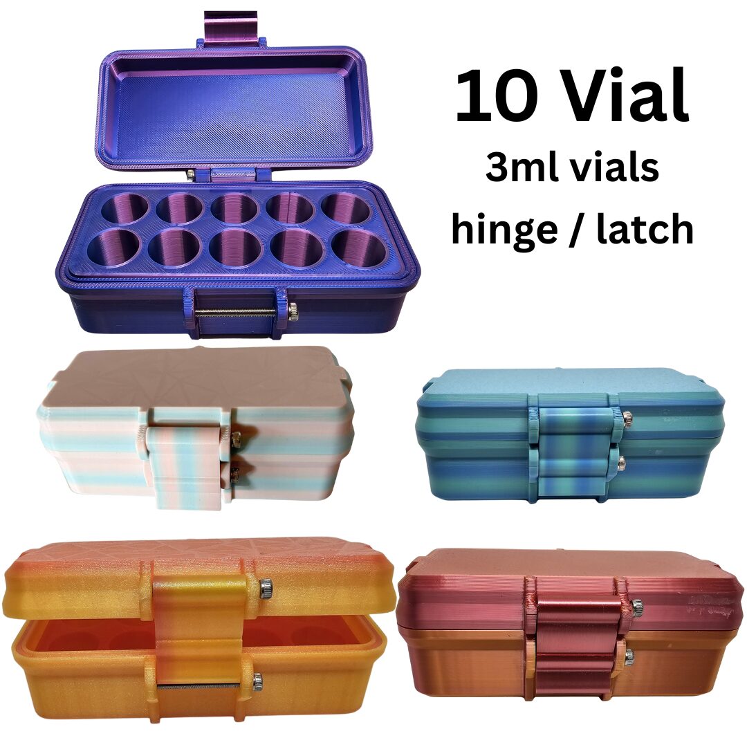 Case holds 10 3-ml vials.  Hard case for your peptide storage!  Beautiful!  Variety of colors and gradients with hinge and latch design and design top.