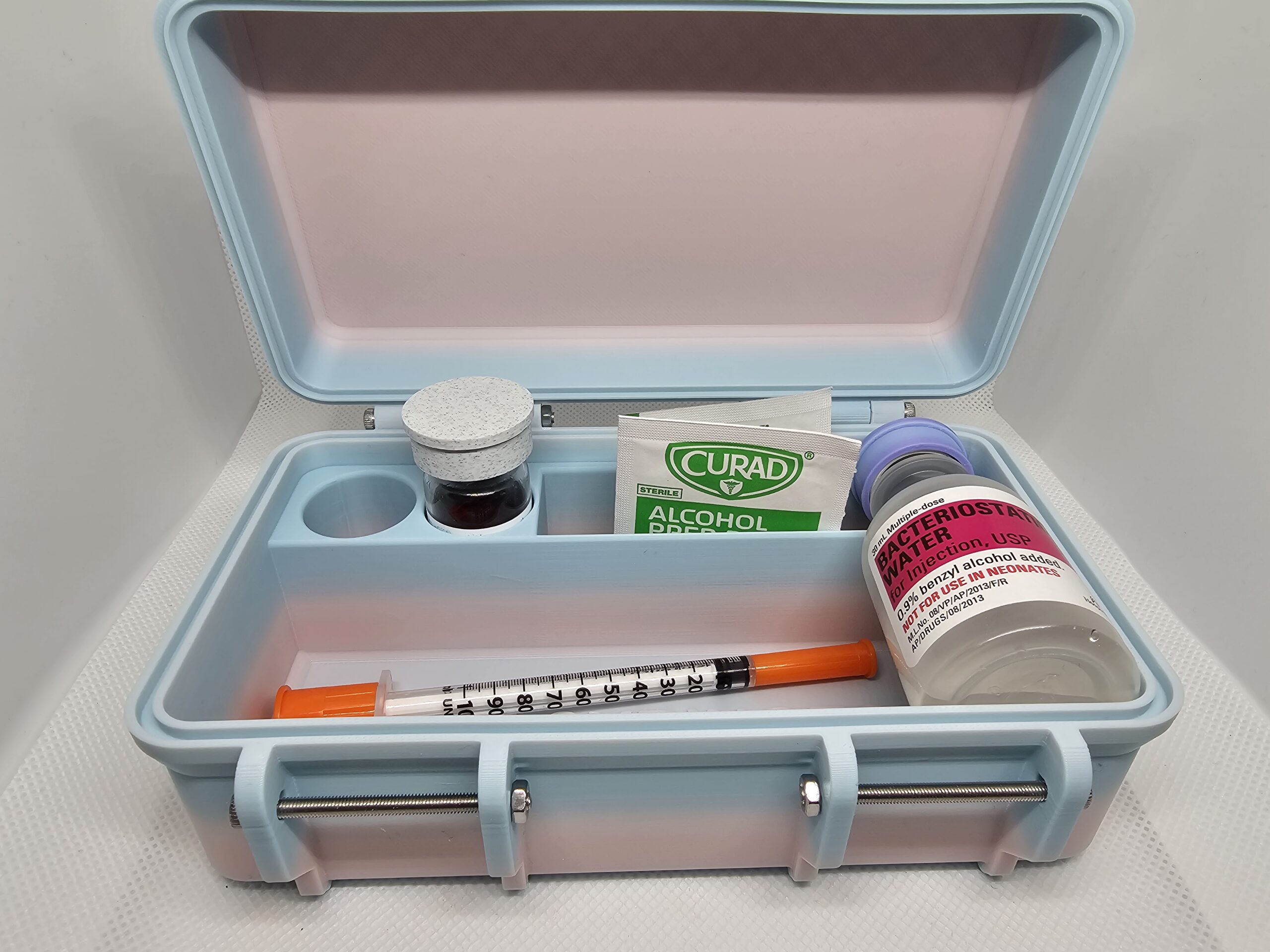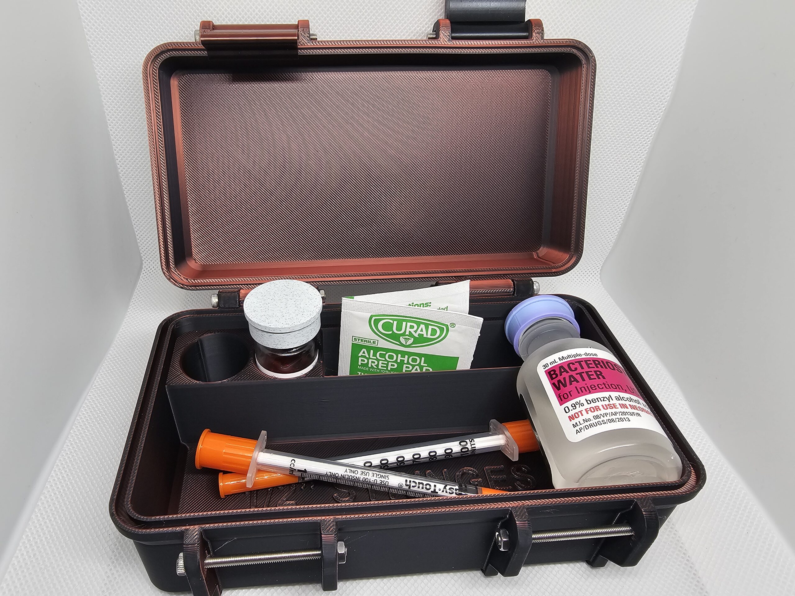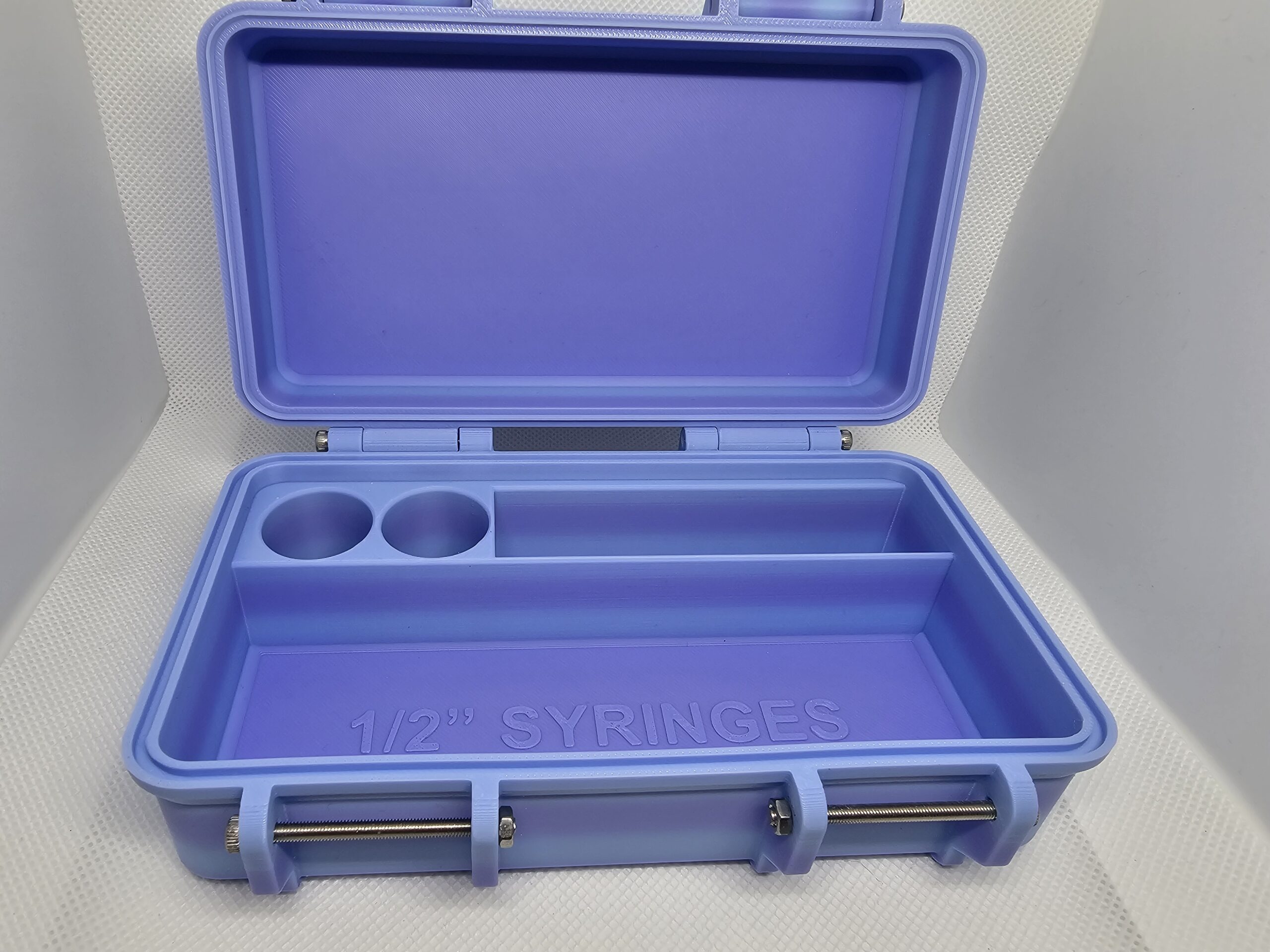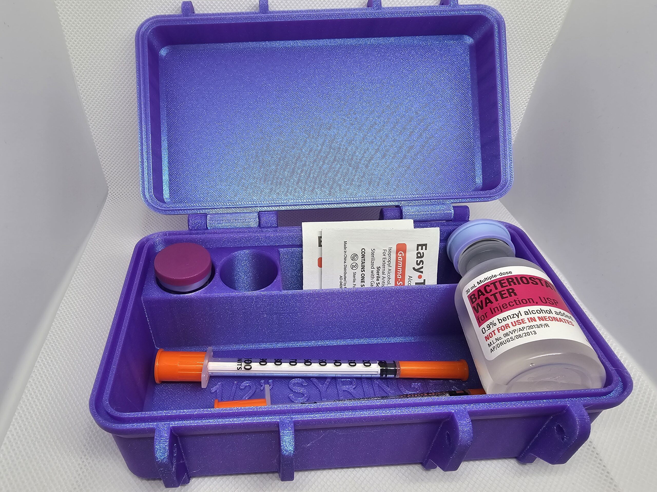 Case holds 2 5ml or 10ml vials, plus a 30ml BAC water, alcohol wipes, and syringes. Hinge design with 2 latches. Colors will vary slightly, especially with gradients.